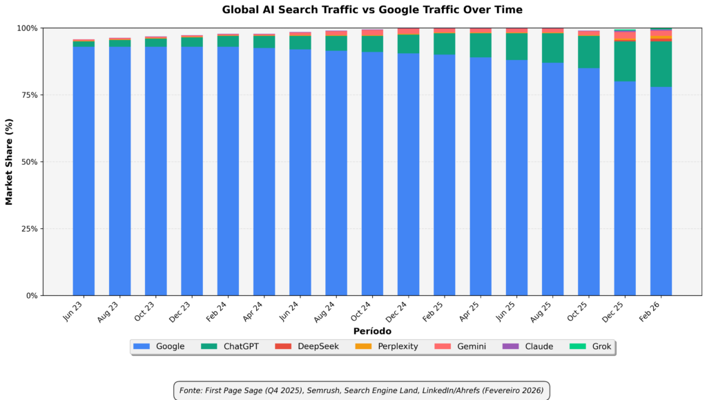 É inegável que as ferramentas de busca por IA estão ganhando espaço, mas também é inegável que o Google continua liderando com muita folga. Dá uma olhada no gráfico de tráfego de buscas atualizado em fevereiro de 2026:
